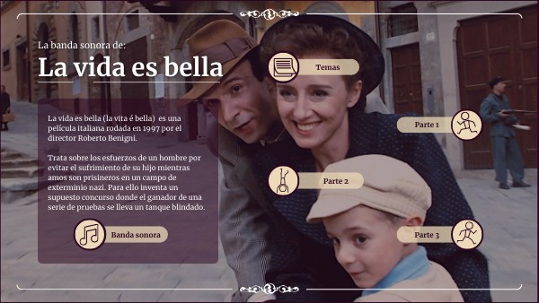Tema 1: La vida es bella (tema de Guido) Es un tema alegre de carácter italiano que se ajusta al caractes bromista y desenfadado del protagonista Guido. Se repite durante toda la película . En la primera parte está en constante expansión y variación, en la segunda se ve absorbido por la situación y en la tercera renace sobreviviendo a su personaje.