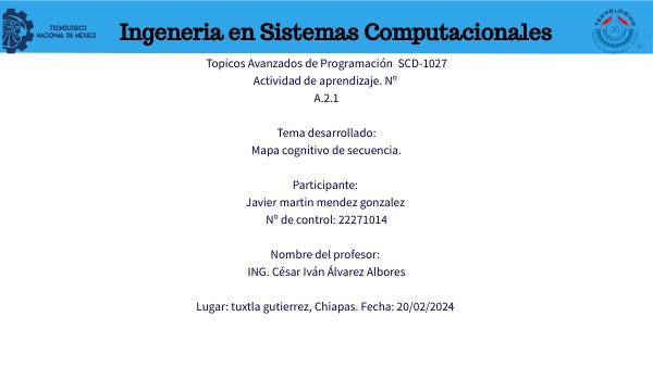 Topicos Avanzados de Programación SCD-1027 Actividad de aprendizaje. Nº A.2.1 Tema desarrollado: Mapa cognitivo de secuencia. Participante: Javier martin mendez gonzalez Nº de control: 22271014 Nombre del profesor: ING. César Iván Álvarez Albores Lugar: tuxtla gutierrez, Chiapas. Fecha: 20/02/2024