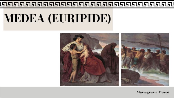 Prologo (vv. 1-95)Il Prologo consta di 3 scene. Nella prima la Nutrice di Medea informa gli spettatori sull’antefatto del dramma e sulla sorte della padrona abbandonata da Giasone che si prepara a sposare Glauce, principessa di Corinto. Nella seconda scena Pedagogo racconta alla donna di avere saputo che il re Creonte ha deciso di cacciare lei e i suoi figli. La terza scena del Prologo è un canto anapestico introduttivo al Parodo: qui Medea invoca la morte per sé, per i figli e per Giasone, mentre la Nutrice cerca di proteggere i bambini dalla rabbia materna, una furia devastante poiché la donna appartiene alla «razza tirannica» abituata da sempre alle prepotenze. Parodo (vv. 131-213) Il Coro ha sentito le grida della donna della Colchide e chiede alla Nutrice spiegazioni. La vecchia risponde che la casa con la famiglia di Medea sta andando in rovina. Si sentono le grida della donna che si augura la morte. La protagonista si rivolge agli dei e indirizza il suo desiderio di distruzione su Giasone e la nuova sposa. La Nutrice e il Coro cercano di aiutare Medea e distoglierla dai suoi istinti suicidi e omicidi, ma la vecchia descrive la donna come bestialmente arrabbiata, quindi espone una sua idea della poesia che dovrebbe consolare gli affanni. Primo episodio (vv. 214-409) Il primo Episodio è diviso in 3 scene intervallate da due brevi interventi del Coro. Nella prima scena Medea descrive la condizione della donna, e la sua in particolare, dichiarando vendetta. Nella seconda scena entra Creonte, e ordina a Medea di andare in esilio, ma la donna, utilizzando la propria intelligenza, riesce a ottenere una proroga, breve ma sufficiente per attuare la sua vendetta. Nella terza scena il Coro in un breve canto, in metro anapestico, compiange le sventure di Medea. Primo Stasimo (vv. 410-445) Il primo Stasimo è diviso in due coppie di strofe. La prima ripete il τόπος del mondo che va a rovescio per un ribaltamento generale. Questo capovolgimento dovrebbe portare a riconoscere che la reputazione di infedeltà con la quale sono state sempre marchiate le donne è immeritata, o per lo meno non è più meritata di quanto sarebbe la taccia di perfidia attribuita agli uomini. Nella seconda coppia strofica il Coro si rivolge a Medea che ha perduto tutto, divenendo vittima del dissolvimento dei valori più forti che sostenevano l’ordine sociale: il pudore e il rispetto dei giuramenti. Lo Stasimo ha struttura metrica dattilo-epitritica.