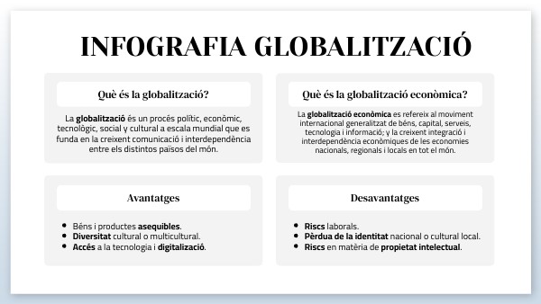 La globalització econòmica es refereix al moviment internacional generalitzat de béns, capital, serveis, tecnologia i informació; y la creixent integració i interdependència econòmiques de les economies nacionals, regionals i locals en tot el món.