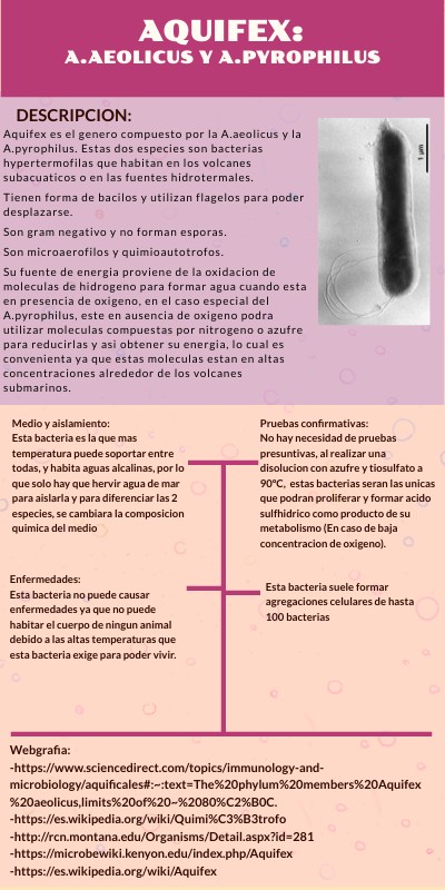 Webgrafia:-https://www.sciencedirect.com/topics/immunology-and-microbiology/aquificales#:~:text=The%20phylum%20members%20Aquifex%20aeolicus,limits%20of%20~%2080%C2%B0C.-https://es.wikipedia.org/wiki/Quimi%C3%B3trofo -http://rcn.montana.edu/Organisms/Detail.aspx?id=281 -https://microbewiki.kenyon.edu/index.php/Aquifex -https://es.wikipedia.org/wiki/Aquifex