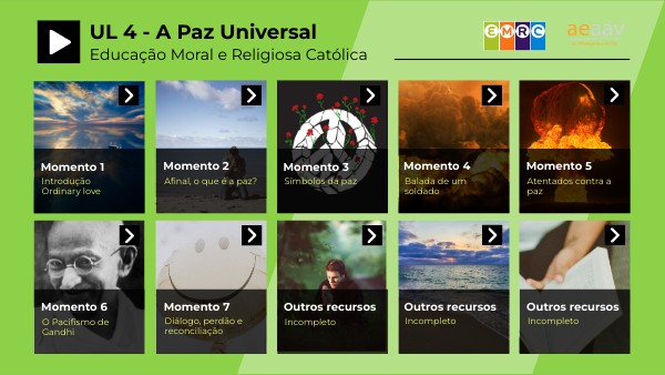 Vídeo da locução: do conteúdo das páginas 134 a 137 – vídeo diálogo, perdão e reconciliação (ao lado) Criação, em grupos, de guias para a paz. (Modelo no ícone) Apresentação à turma (Exposição em espaço da escola) Conclusão com o vídeo 'a missão das religiões e o contributo de cada pessoa para a construção da paz'