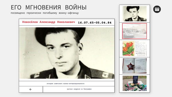 «НОВОСЕЛОВ Александр Николаевич, рядовой, огнеметчик, род. 16.7.1965 в дер.КозиноНолинского р-на Киров, обл. Русский. В Вооруж. Силы СССР призван 4.10.83 Нолинским РВК. В Респ. Афганистан с февр. 1984. Принимал участие в 3 боевых опер-ях. 5.4.1984 в ходе боевой опер-и в провинции Вардак подразделение, в составе которого он служил, вело бой с превосходящей по численности группой пр-ка.Проявив мужество и высокое воинское мастерство, Н. под непрерывным огнем вывел из строя огн. точку пр-ка. Был смертельно ранен при смене огн. позиции. Нагр. орд. Красной Звезды (посмертно). Похоронен в с. ЛудянаЯсашинская Нолинского р-на. ВНолинском р-не ежегодно проводятся соревнования по стрельбе на Кубок его имени.»