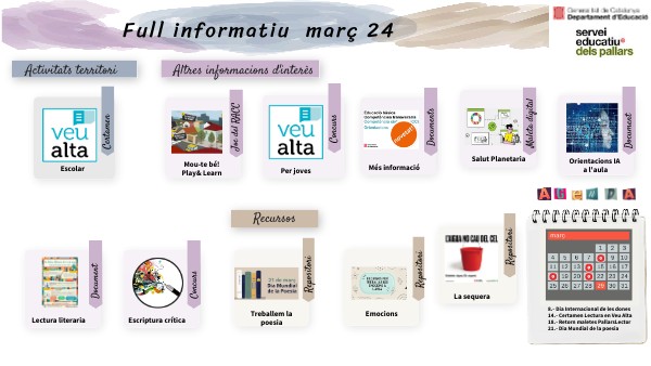 8.- Dia Internacional de les dones 14.- Certamen Lectura en Veu Alta 18.- Retorn maletes PallarsLector 21.- Dia Mundial de la poesia