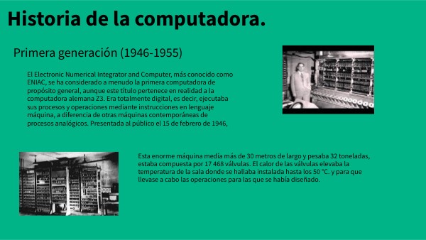 El 14 de febrero de 1946, J.P. Eckert y John Mauchly, presentaron el ENIAC, que resolvía cinco mil adiciones y sustracciones, trescientos cincuenta multiplicaciones o cincuenta divisiones por segundo. Tenía cerca de 19.000 válvulas sustituidas por año. Esta máquina pesaba 30 toneladas, usaba 200 kW y consistía de 18000 tubos al vacío, 1500 relays y cientos de miles de resistores, capacitores e inductores. En 1943, antes de la entrada en operación del ENIAC Inglaterra ya poseía el Colossus, máquina creada por Turing para descifrar los códigos secretos alemanes.