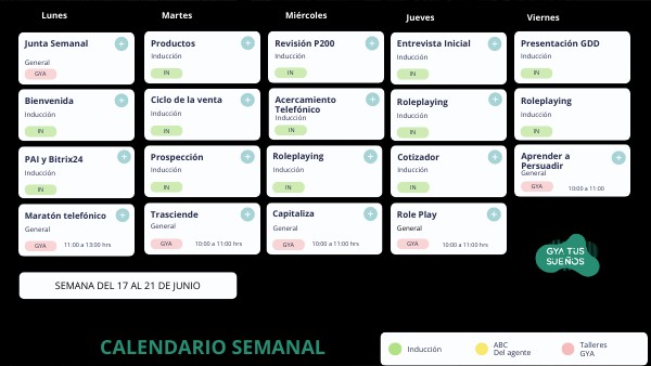 Conoce nuestro Plan Anual de incentivos y Easywork que es un espacio de trabajo en GYA que maneja los numerosos aspectos de operaciones diarias y tareas de la carrera de Agente de Seguros. Incluye CRM, Project Management & una plataforma de colaboración y servicio de tu Coach.