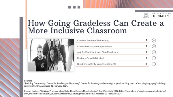 Sources: “Building Community - Centre for Teaching and Learning.” Centre for Teaching and Learning, https://teaching.uwo.ca/teaching/engaging/building-community.html. Accessed 21 February 2024. Dhami, Harleen. “20 Ways Professors Can Make Their Classes More Inclusive.” Top Hat, 4 July 2022, https://tophat.com/blog/classroom-inclusivity/?utm_medium=social&utm_source=twitter&utm_campaign=social-media. Accessed 21 February 2024.