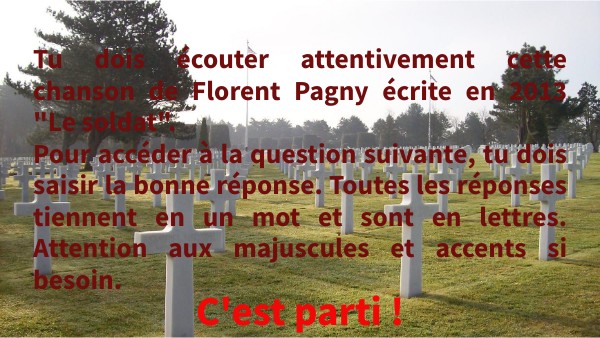 Tu dois écouter attentivement cette chanson de Florent Pagny écrite en 2013 "Le soldat". Pour accéder à la question suivante, tu dois saisir la bonne réponse. Toutes les réponses tiennent en un mot et sont en lettres. Attention aux majuscules et accents si besoin.