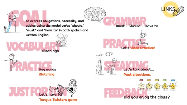To express obligations, necessity, and advice using the modal verbs "should," "must," and "have to" in both spoken and written English.