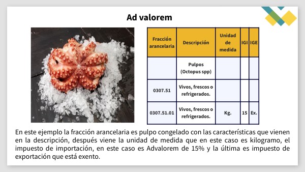 En este ejemplo la fracción arancelaria es pulpo congelado con las características que vienen en la descripción, después viene la unidad de medida que en este caso es kilogramo, el impuesto de importación, en este caso es Advalorem de 15% y la última es impuesto de exportación que está exento.