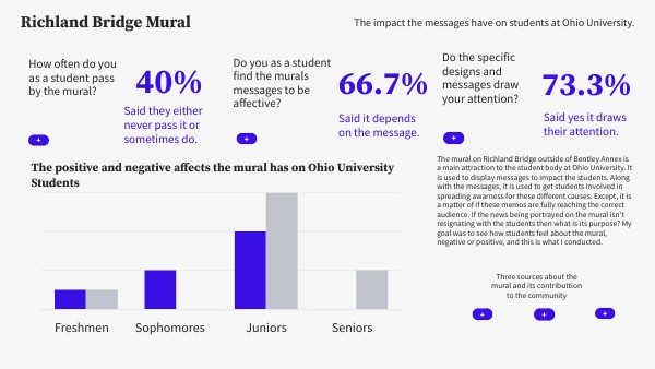The mural on Richland Bridge outside of Bentley Annex is a main attraction to the student body at Ohio University. It is used to display messages to impact the students. Along with the messages, it is used to get students involved in spreading awarness for these different causes. Except, it is a matter of if these memos are fully reaching the correct audience. If the news being portrayed on the mural isn't resignating with the students then what is its purpose? My goal was to see how students feel about the mural, negative or positive, and this is what I conducted.