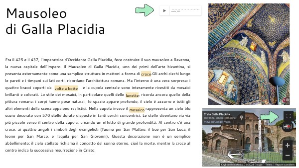 Fra il 425 e il 437, l'Imperatrice d'Occidente Galla Placidia, fece costruire il suo mausoleo a Ravenna, la nuova capitale dell'Impero. Il Mausoleo di Galla Placidia, uno dei primi dell'arte bizantina, si presenta esternamente come una semplice struttura in mattoni a forma di .Gli archi ciechi lungo le pareti e i timpani sui lati corti, ricordano l'architettura romana. Ma l'interno è una vera sorpresa: i quattro bracci coperti da e la cupola centrale sono interamente rivestiti da mosaici brillanti e colorati. Lo stile dei mosaici, in particolare quelli delle , ricorda ancora quello della pittura romana: i corpi hanno pose naturali, lo spazio appare profondo, il cielo è azzurro e tutti gli altri elementi della scena appaiono realistici. Nella cupola invece il mosaico rappresenta scuro decorato con 570 stelle dorate disposte in tanti cerchi concentrici. Le stelle diventano via via più piccole verso il centro della cupola, creando un effetto di grande profondità. Al centro c'è una croce, ai quattro angoli i simboli degli evangelisti (l'uomo per San Matteo, il bue per San Luca, il leone per San Marco, e l'aquila per San Giovanni). Questa decorazione non è un semplice abbellimento: il cielo stellato richiama il concetto del sonno eterno, cioè la morte, mentre la croce al centro indica la successiva resurrezione in Cristo.