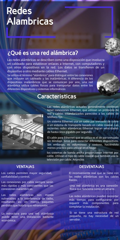 Las redes alámbricas se describen como una disposición que involucra un cableado para establecer enlaces a Internet, con computadores y con otros dispositivos en la red. Los datos se transfieren de un dispositivo a otro mediante cables Ethernet.