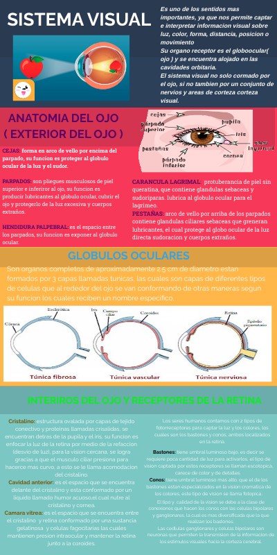 Es uno de los sentidos mas importantes, ya que nos permite captar e interpretar informacion visual sobre luz, color, forma, distancia, posicion o movimientoSu organo receptor es el globoocular( ojo ) y se encuentra alojado en las cavidades orbitaria. El sistema visual no solo cormado por el ojo, si no tambien por un conjunto de nervios y areas de corteza corteza visual.