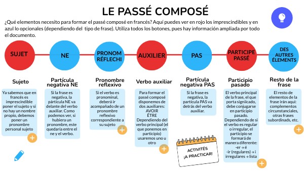 ¿Qué elementos necesito para formar el passé composé en francés? Aquí puedes ver en rojo los imprescindibles y en azul lo opcionales (dependiendo del tipo de frase). Utiliza todos los botones, pues hay información ampliada por todo el documento.