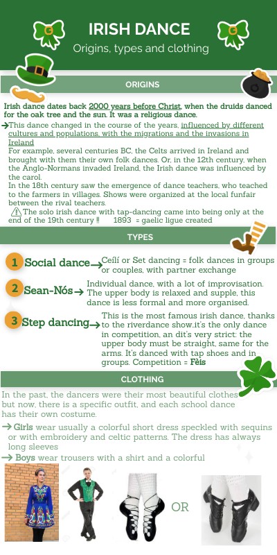 This dance changed in the course of the years, influenced by different cultures and populations, with the migrations and the invasions in Ireland For example, several centuries BC, the Celts arrived in Ireland and brought with them their own folk dances. Or, in the 12th century, when the Anglo-Normans invaded Ireland, the Irish dance was influenced by the carol. In the 18th century saw the emergence of dance teachers, who teached to the farmers in villages. Shows were organized at the local funfair between the rival teachers. The solo irish dance with tap-dancing came into being only at the end of the 19th century !! 1893 = gaelic ligue created