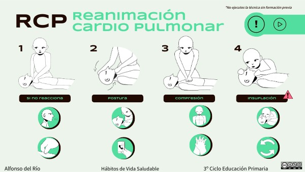 Infografía básica sobre cuándo y cómo debemos realizar una RCP (Reanimación Cardio Pulmonar). A esta infografía la acompañan una pequeña evaluación con preguntas tipo. Trabajo adaptado para aplicarlo a partir de 3º Ciclo de Educación Primaria en el bloque de Hábitos de Vida Saludable.