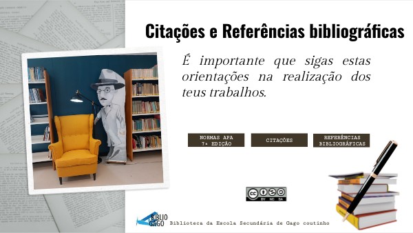 Agrupamento de Escolas Alves Redol. (n.d.). Criar uma bibliografia, citações e referências.https://view.genial.ly/6245f1804cdd8000186b7300/presentation-referencias-bibliograficas
