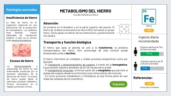 1. Boccio J, Salgueiro J, Lysionek AE, Zubillaga MB, Goldman CG, Weill R, et al. Metabolismo del hierro: conceptos actuales sobre un micronutriente esencial. Archivos Latinoamericanos De Nutricion [Internet]. 2003 [citado el 26 de febrero de 2024];53(2):119–32. Disponible en: http://ve.scielo.org/scielo.php?script=sci_arttext&pid=S0004-06222003000200002 2. Metabolismo del hierro: Absorción, transporte, reciclado y almacenamiento [Internet]. CardioTeca. [citado el 26 de febrero de 2024]. Disponible en: https://www.cardioteca.com/metabolismo-del-hierro.html 3. Hierro [Internet]. Nih.gov. [citado el 26 de febrero de 2024]. Disponible en: https://ods.od.nih.gov/factsheets/Iron-DatosEnEspanol/ 4. Wikipedia contributors. Metabolismo humano del hierro [Internet]. Wikipedia, The Free Encyclopedia. Disponible en: https://es.wikipedia.org/w/index.php?title=Metabolismo_humano_del_hierro&oldid=158090384