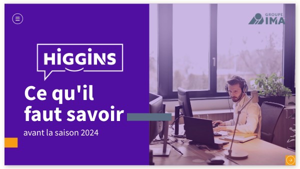 Et pour marquer ce passage, le logo Higgins_ va évoluer. Nouveau visuel aux couleurs de la nouvelle charte graphique IMA, pour plus d'inclusion. Initialement la voiture faisait référence au déplacement. Or comme nous ajoutons progressivement des activités hors déplacement et que les filiales internationales sont aussi concernées, on vous présente le logo Groupe. Il sera visible sur vos postes avant la saison.
