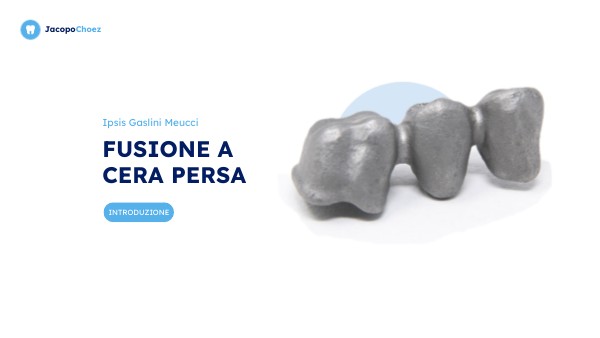 la fusione a cera persa è una tecnica molto utilizzata in odontotecnica perchè ci permette di realizzare in cera (o in un altro materiale calcinabile) l’oggetto da fondere,inglobarlo in una massa refrattaria (rivestimento)affinché vi lasci impressa la propria forma,quindi eliminare la cera e colare nella forma una lega metallica fusa,che,una volta raffreddata e liberata dal rivestimento,avrà assunto la stessa forma dell’oggetto in cera originale.