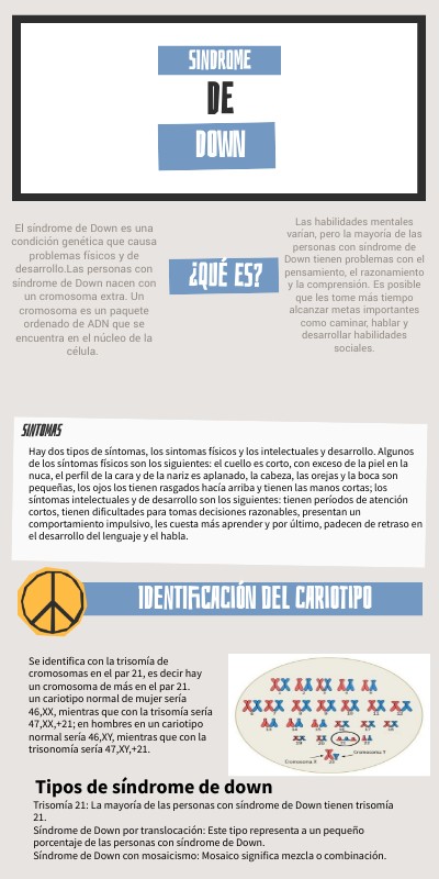 El síndrome de Down es una condición genética que causa problemas físicos y de desarrollo.Las personas con síndrome de Down nacen con un cromosoma extra. Un cromosoma es un paquete ordenado de ADN que se encuentra en el núcleo de la célula.