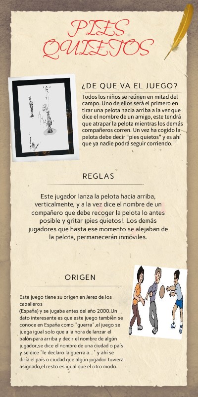 Todos los niños se reúnen en mitad del campo. Uno de ellos será el primero en tirar una pelota hacia arriba a la vez que dice el nombre de un amigo, este tendrá que atrapar la pelota mientras los demás compañeros corren. Un vez ha cogido la pelota debe decir “pies quietos” y es ahí que ya nadie podrá seguir corriendo.