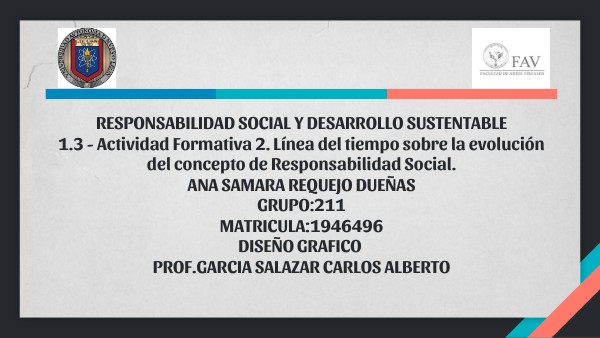 RESPONSABILIDAD SOCIAL Y DESARROLLO SUSTENTABLE 1.3 - Actividad Formativa 2. Línea del tiempo sobre la evolución del concepto de Responsabilidad Social. ANA SAMARA REQUEJO DUEÑAS GRUPO:211 MATRICULA:1946496 DISEÑO GRAFICO PROF.GARCIA SALAZAR CARLOS ALBERTO
