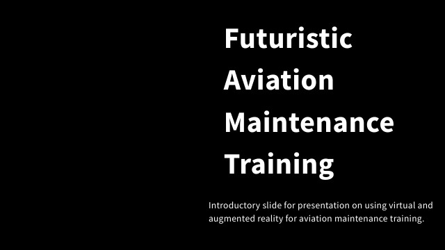 Introductory slide for presentation on using virtual and augmented reality for aviation maintenance training.