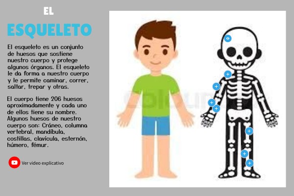 El esqueleto es un conjunto de huesos que sostiene nuestro cuerpo y protege algunos órganos. El esqueleto le da forma a nuestro cuerpo y le permite caminar, correr, saltar, trepar y otras.