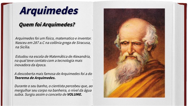 Durante o seu banho, o cientista percebeu que, ao mergulhar seu corpo na banheira, o nível da água subia. Surgiu assim o conceito de VOLUME.