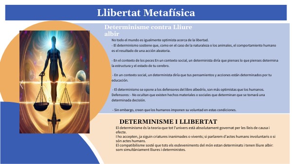 No todo el mundo es igualmente optimista acerca de la libertad.- El determinismo sostiene que, como en el caso de la naturaleza o los animales, el comportamiento humano es el resultado de una acción aleatoria. - En el contexto de los peces En un contexto social, un determinista diría que pienses lo que pienses determina la estructura y el estado de tu cerebro. - En un contexto social, un determinista diría que tus pensamientos y acciones están determinados por tu educación. - El determinismo se opone a los defensores del libre albedrío, son más optimistas que los humanos. Defensores: - No ocultan que existen hechos materiales o sociales que determinan que se tomará una determinada decisión. - Sin embargo, creen que los humanos imponen su voluntad en estas condiciones.
