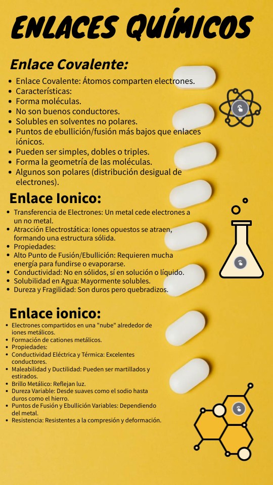 - Enlace Covalente: Átomos comparten electrones.