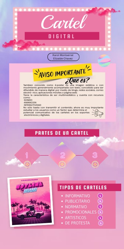 Tambien conocido como é-poster es una imagen estática o con movimiento generalmente acompañada con texto, concebido para ser difundido de manera digital: por medio de blogs, redes sociales, correo electró- nico, aplicaciones móviles o página web. Tiene la característica de ser multimediático y cuenta con recursos como: -SONIDO -ANIMACION -INTERACTIVIDAD No sólo basta con transmitir el contenido, ahora es muy importante estudiar a los usuarios como un factor que determina el potencial comunicativo de los carteles en los soportes electrónicos y digitales.