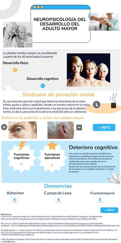 Referencias: Castro V. (s.f). Neuropsicología de la vejez [Modulo en línea]. Universidad Virtual del Estado de Guanajuato. Recuperado de https://avalicmod19c.uveg.edu.mx/mod/scorm/player.php?a=1860¤torg=PDAAM_U3_L8_ORG&scoid=4091 Dif, S. N. (s. f.). ¿Qué es la Discapacidad Auditiva? gob.mx. https://www.gob.mx/difnacional/articulos/que-es-la-discapacidad-auditiva#:~:text=La%20discapacidad%20auditiva%20la%20podemos,caracter%C3%ADsticas%20f%C3%ADsica%20que%20la%20evidencien. Perdikidis Olivieri, L, y Esparza Olcina, MJ. (2017). La profunda privación social deja una huella permanente. Atención Primaria Pediátrica, 19 (76), 373-376. Recuperado el 22 de febrero de 2024, de http://scielo.isciii.es/scielo.php?script=sci_arttext&pid=S1139-76322017000500012&lng=es&tlng=es. UVEG Académico (30 agosto 2021). Desarrollo físico e intelectual de la edad adulta tardía [Video] YouTube https://www.youtube.com/watch?v=R5aRSBC4vAI