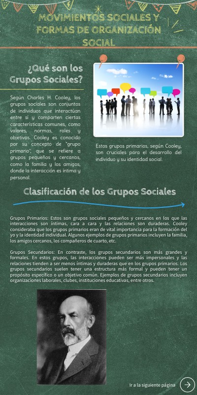Grupos Primarios: Estos son grupos sociales pequeños y cercanos en los que las interacciones son íntimas, cara a cara y las relaciones son duraderas. Cooley consideraba que los grupos primarios eran de vital importancia para la formación del yo y la identidad individual. Algunos ejemplos de grupos primarios incluyen la familia, los amigos cercanos, los compañeros de cuarto, etc. Grupos Secundarios: En contraste, los grupos secundarios son más grandes y formales. En estos grupos, las interacciones pueden ser más impersonales y las relaciones tienden a ser menos íntimas y duraderas que en los grupos primarios. Los grupos secundarios suelen tener una estructura más formal y pueden tener un propósito específico o un objetivo común. Ejemplos de grupos secundarios incluyen organizaciones laborales, clubes, instituciones educativas, entre otros.