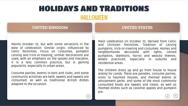 Mainly October 31, but with some variations in the date of celebration. Similar origin, influenced by Celtic festivities. Focus on costumes, pumpkin carving and trick-or-treating, similar decorations are used, with an emphasis on the spooky and macabre, it is a less common practice, but is gaining popularity, especially in urban areas. Costume parties, events in bars and clubs, and some community activities are held, sweets and sweets are consumed, as well as traditional British dishes adapted to the occasion.