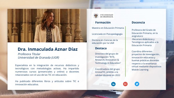 Directora del grupo de investigación "RITE, Research, Innovation & Technology in Education" Coordinadora del grupo InnovaTIC, premio a la calidad docente en 2022