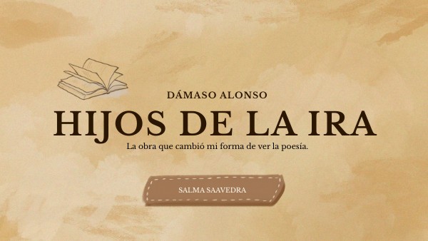 El libro escogido para esta presentación es Hijos de la ira, publicado en 1944 por Dámaso Alonso. Es considerada su obra más destacada, y un pilar en la poesía española.Esta obra supone un giro drástico sobre la poesía escrita hasta la época, iniciando una poesía desarraigada, más humana y auténtica de la que hablaremos más tarde. "Un libro de protesta escrito cuando en España nadie protestaba". Es un libro de protesta y de indagación. Protesta ¿contra qué? Contra todo. Y es que, las grandes figuras son creadores independientes. No se ajustan a los criterios establecidos, si no que plasman su reacción individual ante el exterior. Así, los poetas empiezan a enfrentarsea la realidad tras la publicación de Hijos de la ira (de ahí su gran importancia). Es una protesta contra todo que plasma la ira del poeta ante lo que ve . Dámaso se la dedica a su amigo Emilio García Gómez, un importante arabista español miembro de la RAE. Aparece subtitulado como "Diario íntimo", lo que subraya su caracter autobiográfico y confesional.