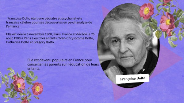 Françoise Dolto était une pédiatre et psychanalyste française célèbre pour ses découvertes en psychanalyse de l'enfance. Elle est née le 6 novembre 1908, Paris, France et décédé le 25 août 1988 à Paris a eu trois enfants: Yvan-Chrysotome Dolto, Catherine Dolto et Grégory Dolto.