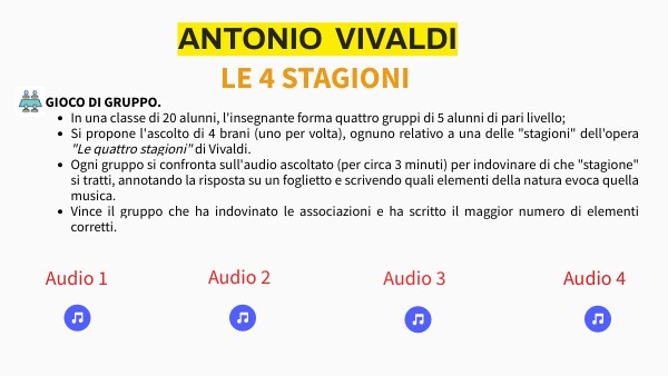 - Si propone l'ascolto di 4 brani (uno per volta), ognuno relativo a una delle "stagioni" dell'opera "Le quattro stagioni" di Vivaldi.