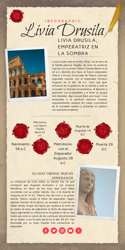 Livia Drusila nace en el año 58 a.C en el seno de la familia patricia Claudia. Se casó en primeras nupcias con su primo Tiberio Claudio Nerón en el 42 a.C, dándole dos hijos, el futuro emperador Tiberio y Druso. Divorciada de Tiberio contrajo segundas nupcias con el emperador Octavio Augusto en el año 38 a.C. Tuvo una gran influencia en el gobierno de su marido y este le concedió su libertad econonómica, el derecho a gestionar sus propiedades y a tener su propia red clientelar, algo inusual para una mujer. Livia encarnaba a la perfecta matrona romana, respresentando siempre las viejas costumbres de la sociedad romana y actuando en público con bastante modestia.