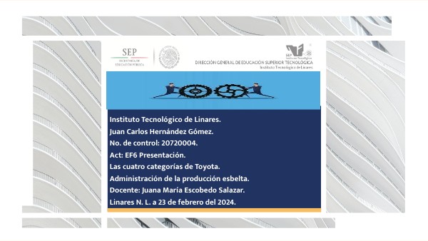 Instituto Tecnológico de Linares.Juan Carlos Hernández Gómez. No. de control: 20720004. Act: EF6 Presentación. Las cuatro categorías de Toyota. Administración de la producción esbelta. Docente: Juana María Escobedo Salazar. Linares N. L. a 23 de febrero del 2024.