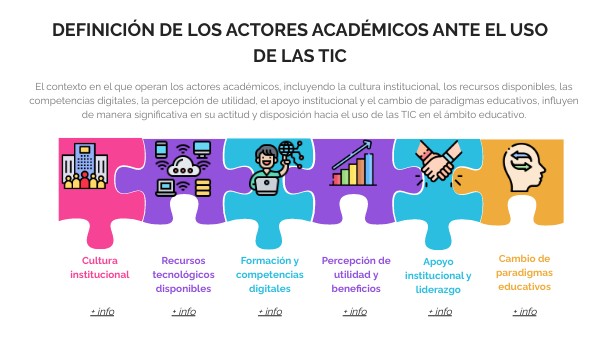 El contexto en el que operan los actores académicos, incluyendo la cultura institucional, los recursos disponibles, las competencias digitales, la percepción de utilidad, el apoyo institucional y el cambio de paradigmas educativos, influyen de manera significativa en su actitud y disposición hacia el uso de las TIC en el ámbito educativo.