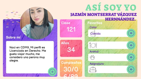 Naci en CDMX, Mi perfil es Licenciada en Derecho. Me gusta viajar mucho, me considero una perona muy alegre.