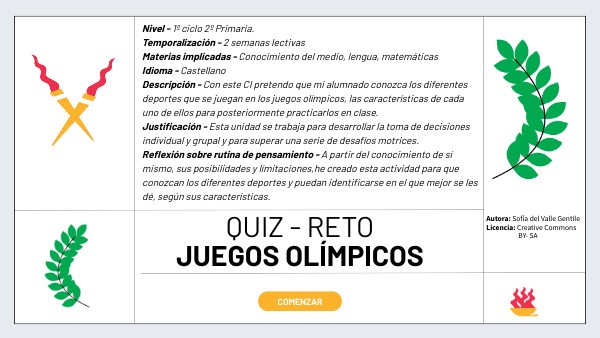 Nivel - 1º ciclo 2º Primaria. Temporalización - 2 semanas lectivasMaterias implicadas - Conocimiento del medio, lengua, matemáticas Idioma - Castellano Descripción - Con este CI pretendo que mi alumnado conozca los diferentes deportes que se juegan en los juegos olímpicos, las características de cada uno de ellos para posteriormente practicarlos en clase. Justificación - Esta unidad se trabaja para desarrollar la toma de decisiones individual y grupal y para superar una serie de desafíos motrices. Reflexión sobre rutina de pensamiento - A partir del conocimiento de sí mismo, sus posibilidades y límitaciones,he creado esta actividad para que conozcan los diferentes deportes y puedan identificarse en el que mejor se les dé, según sus características.