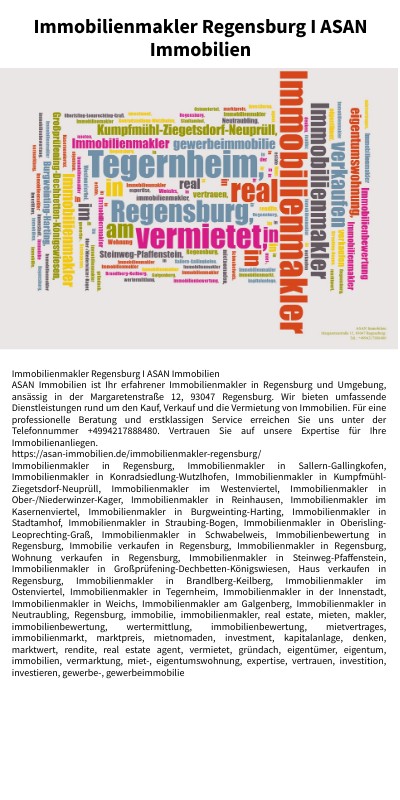 Immobilienmakler Regensburg I ASAN Immobilien ASAN Immobilien ist Ihr erfahrener Immobilienmakler in Regensburg und Umgebung, ansässig in der Margaretenstraße 12, 93047 Regensburg. Wir bieten umfassende Dienstleistungen rund um den Kauf, Verkauf und die Vermietung von Immobilien. Für eine professionelle Beratung und erstklassigen Service erreichen Sie uns unter der Telefonnummer +4994217888480. Vertrauen Sie auf unsere Expertise für Ihre Immobilienanliegen. https://asan-immobilien.de/immobilienmakler-regensburg/ Immobilienmakler in Regensburg, Immobilienmakler in Sallern-Gallingkofen, Immobilienmakler in Konradsiedlung-Wutzlhofen, Immobilienmakler in Kumpfmühl-Ziegetsdorf-Neuprüll, Immobilienmakler im Westenviertel, Immobilienmakler in Ober-/Niederwinzer-Kager, Immobilienmakler in Reinhausen, Immobilienmakler im Kasernenviertel, Immobilienmakler in Burgweinting-Harting, Immobilienmakler in Stadtamhof, Immobilienmakler in Straubing-Bogen, Immobilienmakler in Oberisling-Leoprechting-Graß, Immobilienmakler in Schwabelweis, Immobilienbewertung in Regensburg, Immobilie verkaufen in Regensburg, Immobilienmakler in Regensburg, Wohnung verkaufen in Regensburg, Immobilienmakler in Steinweg-Pfaffenstein, Immobilienmakler in Großprüfening-Dechbetten-Königswiesen, Haus verkaufen in Regensburg, Immobilienmakler in Brandlberg-Keilberg, Immobilienmakler im Ostenviertel, Immobilienmakler in Tegernheim, Immobilienmakler in der Innenstadt, Immobilienmakler in Weichs, Immobilienmakler am Galgenberg, Immobilienmakler in Neutraubling, Regensburg, immobilie, immobilienmakler, real estate, mieten, makler, immobilienbewertung, wertermittlung, immobilienbewertung, mietvertrages, immobilienmarkt, marktpreis, mietnomaden, investment, kapitalanlage, denken, marktwert, rendite, real estate agent, vermietet, gründach, eigentümer, eigentum, immobilien, vermarktung, miet-, eigentumswohnung, expertise, vertrauen, investition, investieren, gewerbe-, gewerbeimmobilie