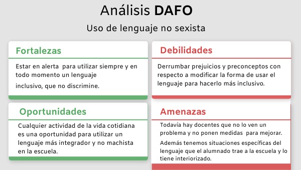 Todavía hay docentes que no lo ven un problema y no ponen medidas para mejorar. Además tenemos situaciones específicas del lenguaje que el alumnado trae a la escuela y lo tiene interiorizado.