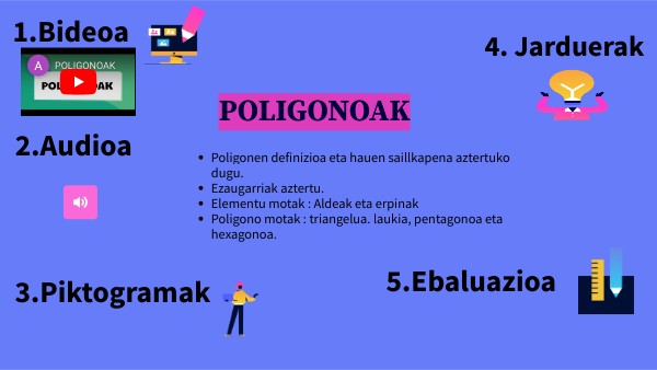 - Poligono motak : triangelua. laukia, pentagonoa eta hexagonoa.