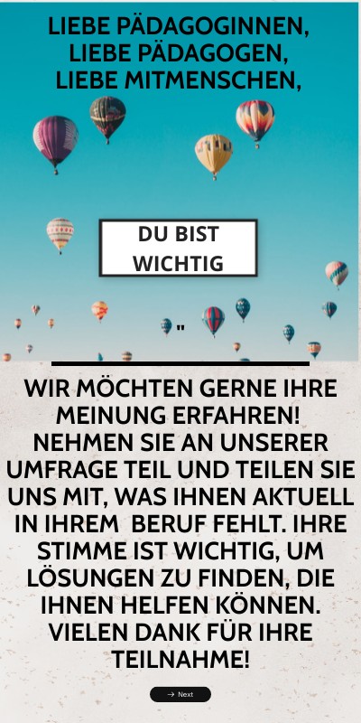 " Wir möchten gerne Ihre Meinung erfahren! Nehmen Sie an unserer Umfrage teil und teilen Sie uns mit, was Ihnen aktuell in Ihrem Beruf fehlt. Ihre Stimme ist wichtig, um Lösungen zu finden, die Ihnen helfen können. Vielen Dank für Ihre Teilnahme!